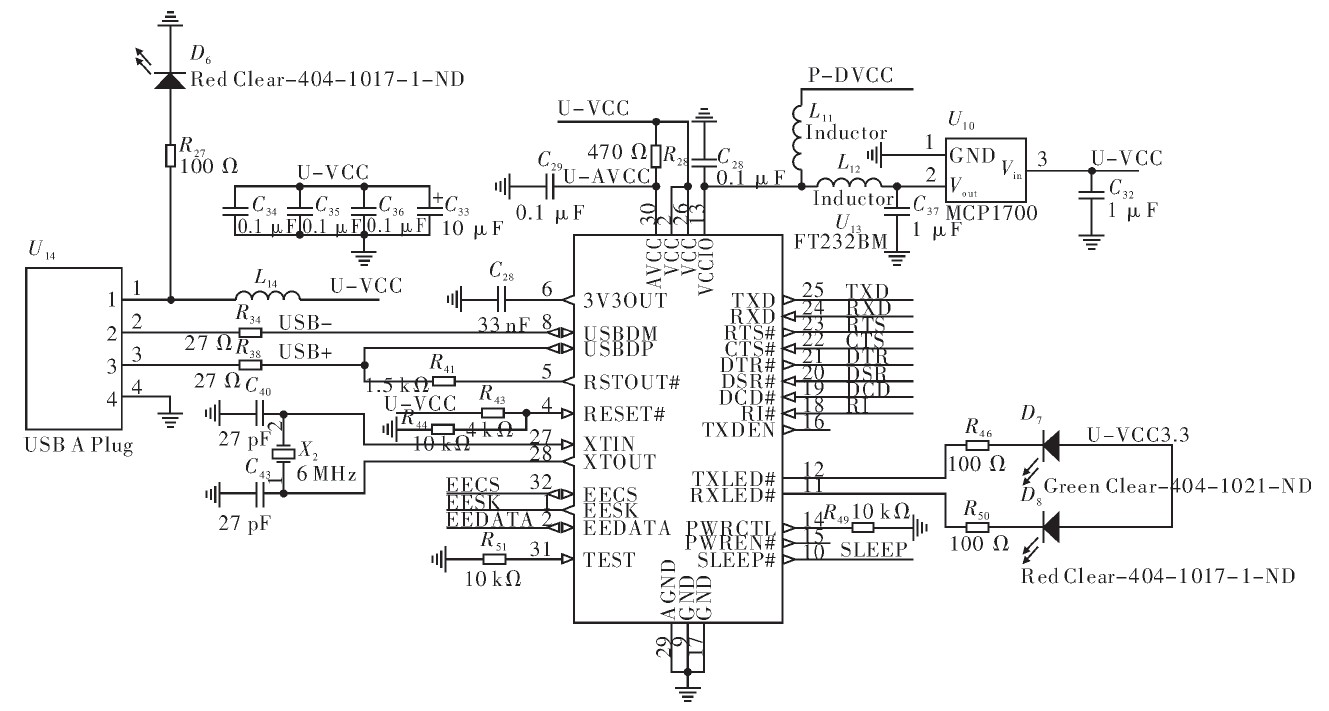 無線傳感器網(wǎng)絡(luò)由大量節(jié)點組成,這些節(jié)點按一定協(xié)議將采集的數(shù)據(jù)進行融合、傳輸,最終將數(shù)據(jù)傳送到個人電腦上進行處理和觀察,同時節(jié)點工作需要將特定的程序?qū)懭隖lash中。目前個人電腦最常用的接口為USB,而微處理器使用USART接口,為實現(xiàn)兩種接口之間轉(zhuǎn)換,節(jié)點使用FT232BM芯片作為轉(zhuǎn)換芯片。FT232BM是一種單片USB到異步串口轉(zhuǎn)換芯片,支持全握手和調(diào)制解調(diào)接口信號,在TTL級數(shù)據(jù)傳輸速度范圍為300 bit·s-1~3 Mbit·s-1.芯片通過USB總線供電,工作電壓為4.35~5.25 V,采用外部6 MHz時鐘。USB PID、序列號和產(chǎn)品信息可以保存在外部EEPROM中。USB通信模塊接口如圖5所示。