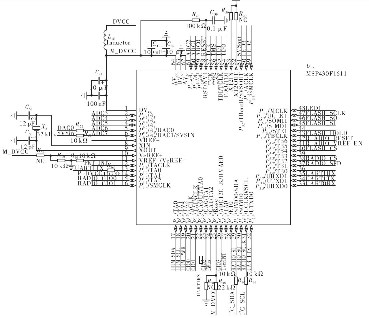 微處理器是無線傳感器節(jié)點的核心,傳感器數(shù)據(jù)的數(shù)據(jù)處理,串行口以及無線模塊的傳輸與控制均需要微處理器的參與。節(jié)點微處理器TI公司的16為超低功耗MSP430F1611.該微處理器工作電壓為1.8~3.6 V,在RAM數(shù)據(jù)保持方式下耗電僅為0.2μA,在激活工作1 MHz的情況下為330μA,可以工作在5中低功耗模式,喚醒時間<6μm.Flash大小為48 kB,RAM大小為10 kB.芯片內(nèi)部有16位定時器Timer_A和Timer_B具有捕獲/比較功能;大量的捕獲/比較寄存器可用于事件計數(shù)、時序發(fā)生等;多功能串口(USART)可以實現(xiàn)異步、同步和I2C串行通信,可以方便地實現(xiàn)多級通信的應(yīng)用;具有較多的I/O端口,最多達6×8條I/O口線,P1、P2口還可以接收外部上升或下降沿的中斷輸入;12位A/D轉(zhuǎn)換器有較高的轉(zhuǎn)換速率,最高可達200 kbit·s-1,能滿足大多數(shù)數(shù)據(jù)采集的應(yīng)用。微處理器模塊如圖6所示。溫度濕度傳感器連接P1口5、6、7管腳,無線模塊SPI接在P3口1、2、3和P4.4管腳,USB通信模塊數(shù)據(jù)線連接到P3口6、7管腳。其他管腳分別用于控制和擴展接口。外部晶振大小為32MHz。