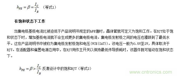 在基極發射極結點處于正向偏置,而集電極至發射極路徑為偏置時,這可打開洪流柵極,允許電流流動。連接至集電極的正偏置會吸引自由電子流向集電極端,在N材料中形成電子匱乏。這可吸引來自基極的電子,將其耗盡在N材料中。現在電流就可流經集電極和發射極的耗盡層,形成完整電路。集電極電流(IC)的數量可能會比基極電流(IB)多好幾個數量級。IC與IB之間的比值一般稱為晶體管的DC電流增益。在產品說明書中也可表達為Beta(β)或hFE。注意,在晶體管產品說明書中,該比值在特定條件下給出,可能會有明顯的變化。
