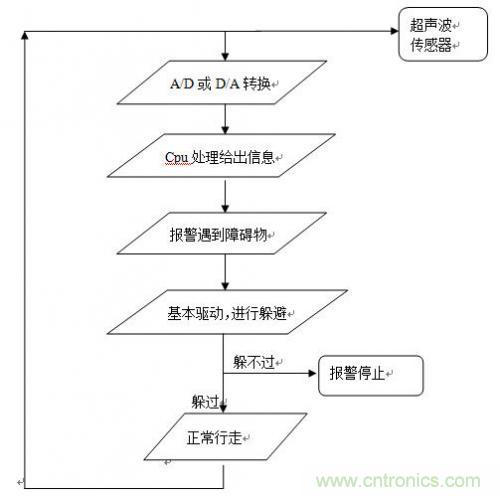 通過CMOS攝像頭采集路況信息,經(jīng)CPU處理判斷前方是否有障礙物。若無,則車繼續(xù)引導(dǎo)人前行;若有障礙物,則車發(fā)聲報警。通過超聲波傳感器檢測,如果可以越過則繼續(xù)前進,如果無法越過,就停止。如果需要轉(zhuǎn)彎,則減速轉(zhuǎn)彎。同時導(dǎo)盲車上還有GPS導(dǎo)航系統(tǒng),可以確切知道盲人所處位置。
