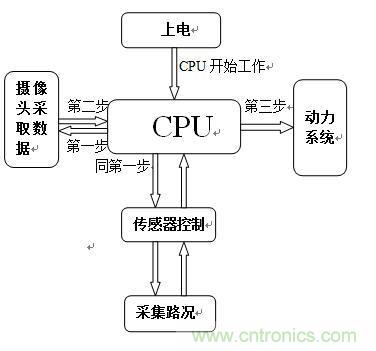 說明:上電之后,CPU開始工作。首先,CPU開始控制攝像頭和傳感器同時工作,同時采集信息,把采集回來的信息進行分析,在CPU內(nèi)部進行A/D或D/A轉(zhuǎn)換,然后將轉(zhuǎn)換后的信息傳遞給舵機,使舵機在CPU的控制下進行工作。