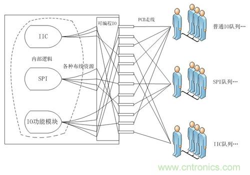 實際FPGA內(nèi)部并不像圖2那么簡單,這里只是為了形象說明可編程IO可以使內(nèi)部邏輯和PCB可以相對獨立設(shè)計。對于同類接口,不必因為PCB改變而更改時序邏輯,只需要更改引腳分配,大大簡化了PCB的布線難度。