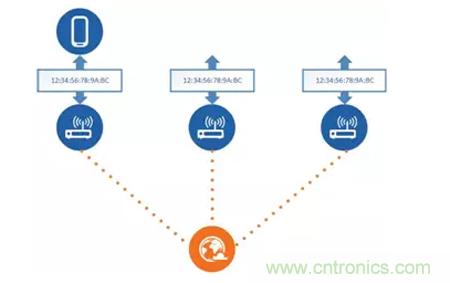我們可以試想一下,當我們每天搭乘公共交通穿行了整個城市,當我們在商場購物或是和朋友在餐廳聚餐的時候,你的智能手機可以幫助你付費、點單和導航。如果你的智能手機接入到網絡熱點當中進行互聯網訪問的時候,它就可能會在這一系列的過程當中來廣播其MAC地址。我們前面提到了MAC地址在網絡通信當中的唯一性,你又是智能手機的使用者,那么這部智能手機的MAC地址從某一角度來講,就代表了你在無線通信過程當中的身份認證。因此就存在這樣一種可能,一些懷有惡意的人通過一些其他的無線通信設備,可以獲取你的智能手機進行數據交互時的MAC地址并且記錄了MAC地址出現的日期、時間和相關的位置,那么你的行蹤就可以被監控,如下圖所示。
