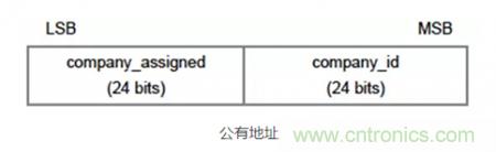 公有地址的構成包含了兩個部分,一部分是公司識別碼(Company ID),其需要通過IEEE注冊機構付費獲得,公司識別碼長度為24比特,處于48比特設備地址的高24比特;另外一部分是公司分配碼(Company Assigned ID),其長度也為24比特,處于48比特設備地址的低24bit,如下圖所示。