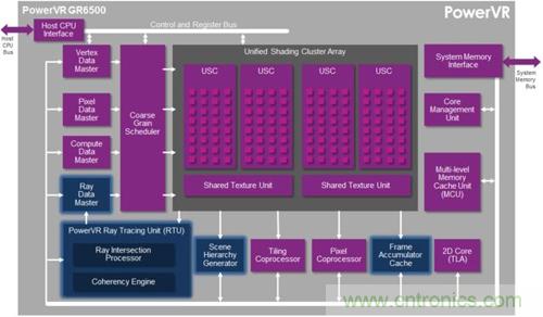 新家族的第一名成員是PowerVR GR6500,基于最新一代的四陣列移動GPU PowerVR Rogue設(shè)計(jì)而來,整合了PowerVR Series6 XT系列的所有特性,并加入了強(qiáng)大的光線追蹤硬件加速電路。