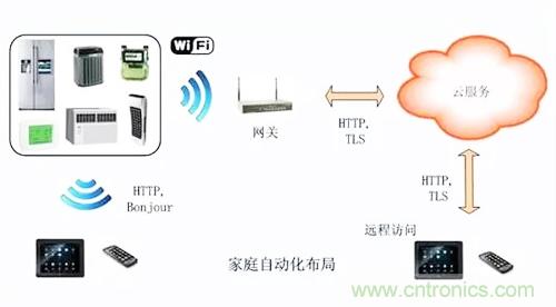 從上圖可看出,家庭自動化系統將嵌入式微控制器技術、無線連接、接入網絡融合為一體。Apps軟件能夠使用戶發現家里的設備,予以設置,或者創建一個動作加以控制。