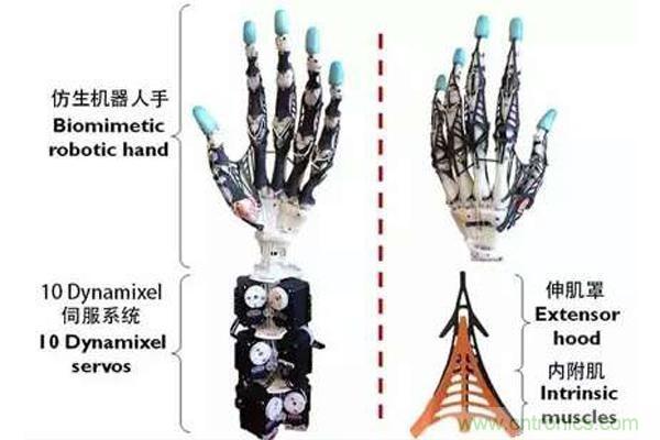 「擬人機(jī)器手設(shè)計的常規(guī)方法是,用類似鉸鏈、聯(lián)動裝置和平衡環(huán)等零件來實現(xiàn)生物部件的機(jī)械化,從而將看似復(fù)雜的人體參照物進(jìn)行了簡化。這種方法對于理解并模仿人手的運(yùn)動原理有一定幫助,但不可避免的制造了一些人與機(jī)械手之間的不良差異,因為人手上大多數(shù)顯著的生物力學(xué)特征都在機(jī)械化的過程中被丟棄了。這些機(jī)器手和人手生物力學(xué)在本質(zhì)上的不匹配阻礙了我們使用自然的手部運(yùn)動來直接控制它們。因此,還沒有任何一只擬人機(jī)器人手可以達(dá)到人手的靈巧程度。」