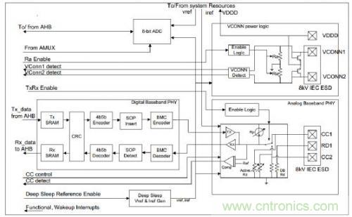 本設計在充電器和手機側都采用了賽普拉斯第二代Type-C PD控制器 CCG2。手機側芯片支持死電池(Dead Battery)充電,同時采用了1.6mm*2.0mm 的CSP封裝,外部器件也僅有幾個電阻電容,節省了布局布線面積[2];充電器則采用QFN封裝的芯片,降低貼片和測試成本,并且解決了無220V AC輸入時連接手機的漏電問題。 CCG2使用了帶有 32 KB閃存的 32 位48 MHz ARM® Cortex®-M0 處理器,具有完備的USB-PD子系統,如圖 3所示。該子系統包含一個USB Type-C收發器和物理層邏輯,收發器執行BMC 和4b/5b 編碼、解碼功能以及1.2 V的前端偏置,而且還集成了完成TYPE-C連接所需的終端電阻RP (DFP)、RD (UFP)和RA (EMCA),無需復雜的外圍電阻或者電流源陣列。CCG2可以支持PD2.0的所有協議以及PD3.0在充電領域的協議,足以滿足快速充電或者直充的需求。CCG2內部的高精度SAR(逐次逼近寄存器)ADC,可以實現對于電壓電流的數據采集,實現AC/DC之前的另一級閉環控制或者監控,實現完美的TYPE-C端口供電控制解決方案。