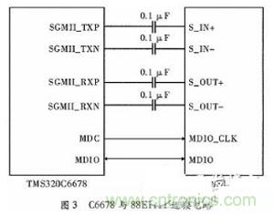 C6678和PHY芯片88E1111的接口電路如圖3所示。88E1111工作在SGMII接口模式下,不需要TXCLK時鐘輸入,更有助于減少電路板上走線的數量,同時也可減少噪聲的產生。