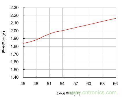 在負載電阻由45Ω不斷增大到66Ω時,節(jié)點的輸出差分電壓也隨著由1.84V增大到2.16V,兩者近似線性關系。為了使發(fā)送節(jié)點的輸出差分電壓不至于過低,實際組網時負載電阻應在圖 1測試的范圍內波動。我們分析RL的組成有3個:終端電阻、總線節(jié)點的差分輸入電阻、總線本身的有效電阻。