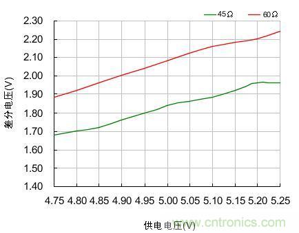 差分電壓除負載電阻的影響外,還會受到供電電壓的影響,如圖 2我們測試了CTM1051M模塊在不同電壓,不同負載下的差分電壓幅值,可以看到電源電壓升高0.5V,差分電壓幅值會升高約0.3V。