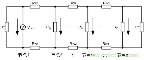 圖 3為CTM1051M推薦的組網拓撲,我們要考慮總線電阻,終端電阻,發(fā)送點,接收點電壓參數。畫出其等效電路如圖 4所示。