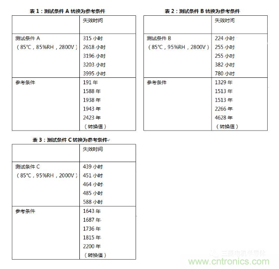 這里,參考條件定義為RHu=75%,Tu=25℃和Vu=1500V。通過公式(1),可以得到測試條件A中的加速因子αf_A為5.31k,測試條件B中的加速因子αf_B為52.0k,測試條件C中的加速因子αf_B為32.8k。綜合這些加速因子,溫濕反偏試驗測試A、測試B和測試C轉換為如表1、表2和表3所示的參考條件。