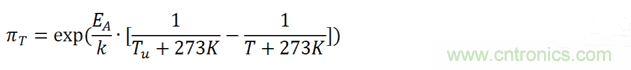 公式中,αf為測試的加速因子,也就是加速(后綴為a)測試條件下MTTF(Mean Time To Failures,平均無故障時間)與參考(后綴為u)測試條件下MTTF之比。EA是活化能,在0.79eV和0.95eV之間,k為玻爾茲曼常數。指數x為相對濕度的影響,指數y為電壓的影響,都是經驗數據,但是必須通過實際評估來確認。我們把此加速模型擴展到壽命預估模型中。