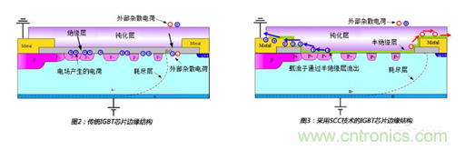 為了抑制IGBT芯片邊緣電荷集聚,SCC技術采用了優化的半絕緣性材料替代傳統的絕緣材料,這個半絕緣性層為集聚的載流子提供了通路,如圖3所示,在高濕工況下,產生的載流子會通過半絕緣層傳遞出去,避免了電荷的大量集聚。