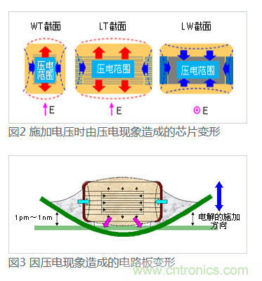● 片狀獨(dú)石電容器由于強(qiáng)介電常數(shù)的陶瓷的壓電特性,在施加交流電壓的情況下,像如圖2所示進(jìn)行收縮。