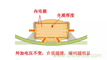 陶瓷介質(zhì)是MLCC主要組成部分,電壓作用下,電致伸縮不可避免。如電致伸縮強(qiáng)烈表現(xiàn)為壓電效應(yīng),則會(huì)產(chǎn)生振動(dòng)。
