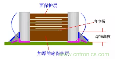 由于保護(hù)層厚度部分是沒有內(nèi)電極的,這部分的BaTiO3陶瓷不會(huì)發(fā)生形變,當(dāng)兩端的焊錫高度不超過底保護(hù)層厚度,這時(shí)產(chǎn)生的形變對(duì)PCB影響要小,有效地降低噪聲。