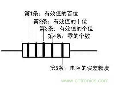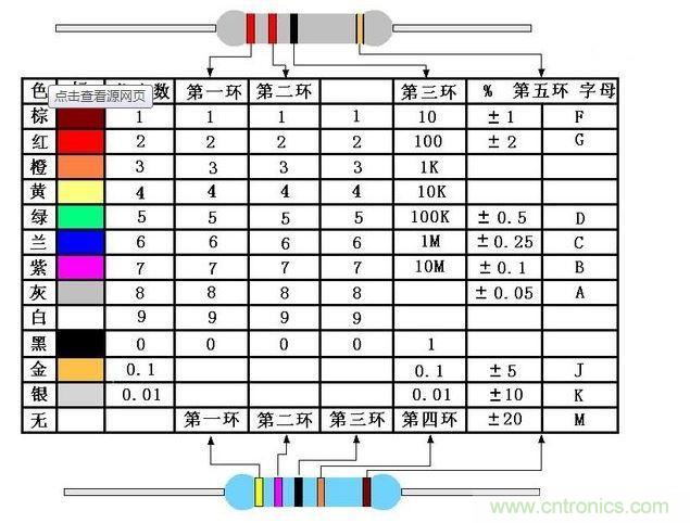 電阻器上用不同顏色的環(huán)來表示電阻的標稱阻值,常見的電阻器有四色環(huán)電阻和五色環(huán)電阻。四色環(huán)電阻,一般是碳膜電阻,用三個色環(huán)來表示阻值,用一個色環(huán)表示誤差。五環(huán)電阻一般是金屬膜電阻,精度更高,常用四個色環(huán)表示阻值,另一個色環(huán)表示誤差。