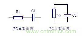電路中電阻與電容組合在一起的電路稱為RC電路,圖中R1和C1構成了RC串聯(lián)電路,R2和C2構成了RC并聯(lián)電路。