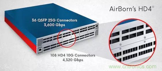 圖12:針對高密度設計的AirBorn 10GHD4®連接器可在同一托架系統內提供比25G QSFP連接器更高的吞吐量,從而實現組件和能源成本節省。