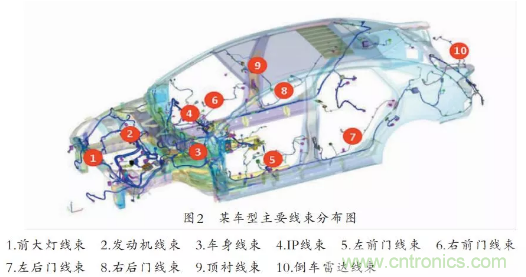隨著車輛安全、智能、舒適性的發(fā)展,傳感器、攝像頭及ECU占據(jù)了一定的空間,從而造成線束的布置空間越發(fā)狹小,同時功能的增加意味著導(dǎo)線數(shù)量及體積不斷增大。整車可裝拆性、運輸便利性等也對線束提出了更高的要求。下圖2 是上汽通用某車型的線束發(fā)布圖, 為便于運輸和裝配,將整車線束切割成11個部分。
