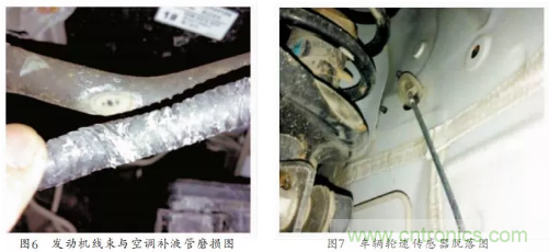 如下為兩種典型失效方式,圖6為發(fā)動機線束與空調(diào)補液管之間震動接觸造成的磨損,圖7為車輛輪速傳感器在運動到極限位置時悶頭受力后脫落。綜上需嚴(yán)格控制線束在運動包絡(luò)區(qū)域的布置,同時針對線束的磨損需遵循嚴(yán)格的評估標(biāo)準(zhǔn)。