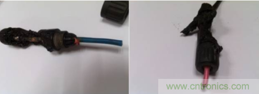 而在失效的樣品中就有兩個是用了不同的電纜,且外徑相差懸殊。圖11 中的左側圖連接器一側用的是光伏電纜(黑色),外徑為6mm,而另一側則是用的 普通線纜(藍色),外徑僅為4mm。將藍色電纜端的螺帽擰開后發現可能由于密封不夠竟采用了紅色塑料片填充。在該種情況下連接器是很難保證其密封性,因此,在戶外應用時有可能會進水進塵,從而破壞絕緣性能,進而引發火災。
