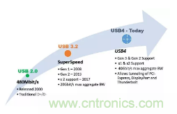 畢竟USB4是下一代USB數據規范,增加了接口帶寬并支持其他協議共享物理接口。共享USB接口的最大協議是英特爾的Thunderbolt。自2000年以來,USB-IF一直在系統地提高接口的吞吐量,以滿足客戶不斷增長的數據需求。從2000年的USB 2.0開始,到2013年的USB3.2,USB數據速率已從480Mbps擴展到20Gbps。USB4將進一步提高數據速率到40Gbps吞吐量。