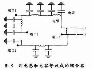 由于第二部分設(shè)計的天線傳輸線阻抗是50 Ω,所以1/4傳輸線的阻抗是70.7 Ω,將710 MHz代入,則可以求得L=15.8 nH,C=3.17 pF。這樣,就可以設(shè)計出180°的混合耦合器如圖8所示。將耦合器的3,4端口通過通孔連接天線,1,2端口接饋電網(wǎng)絡(luò),就可構(gòu)成一個雙天線的去耦合系統(tǒng)。