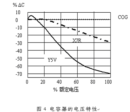 電容器的電容量不僅隨著溫度變化,還會隨著工作電壓變化,這一點在實際工程必須注意。不同介質材料的電容器的電壓特性如圖3所示。從圖中可以看出,X7R電容器在額定電壓狀態下,其容量降為原始值的70%,而Y5V電容器的容量降為原始值的30%!了解了這個特性,在選用電容時要在電壓或電容量上留出余量,否則在額定工作電壓狀態下,濾波器會達不到預期的效果。