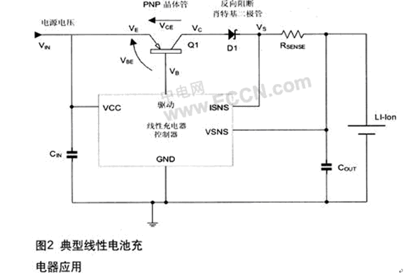 線性充電器設計簡單,體積較小,并且沒有"開關模式轉換器"常有的噪音,這些優(yōu)點使得線性充電器特別適用于小功率、低噪音應用。線性充電器使用外部調節(jié)元件,以將電池電壓由輸入電源降至電池電壓,因此功率損耗較大。圖2顯示具備外部調節(jié)元件與反向阻斷肖特基二極管的典型線性充電器應用。