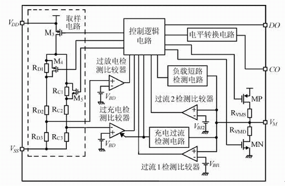 鋰離子電池保護(hù)電路為了實現(xiàn)其基本功能,首先需要檢測異常現(xiàn)象。過充電和過放電檢測是將電池電壓進(jìn)行分壓(采樣)后與基準(zhǔn)電壓比較實現(xiàn)的;而對于過流檢測,保護(hù)芯片首先將充放電過程中的電流轉(zhuǎn)化為在功率管FET1、FET2上的電壓,然后通過VM與基準(zhǔn)電壓比較完成,放電過流檢測的是正電壓,充電過流檢測的是負(fù)電壓。