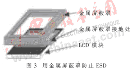 其二,用“疏”的方法。可以用EMI油漆噴涂在殼體的內側。EMI油漆是導電的,可以看成是一個金屬的屏蔽層,這樣可以將靜電導在殼體上;再將殼體與PCB(Printed Circuit Board)的地連接,將靜電從地導走。這樣處理的方法除了可以防止靜電,還能有效抑制EMI的干擾。如果有足夠的空間,還可以用一個金屬屏蔽罩將其中的電路保護起來,金屬屏蔽罩再連接PCB的GND。圖3是用金屬屏蔽罩將LCD模塊保護起來的例子。