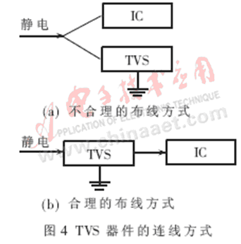 因為TVS具有體積小、反應速度快等優點,現在的設計中使用TVS作為防護器件的比例越來越多。目前TVS級間等效電容越做越小,所以適合芯片的保護。在使用時應注意放在需要保護的器件旁邊,到地的連線盡可能短,器件的布線應成串聯型,而不能布成并聯型。如圖4所示。