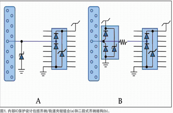 例如,與信號(hào)輸入相關(guān)的IC焊墊的特點(diǎn)是齊納二極管和結(jié)型鉗位二極管連接供電軌(圖1a),或者兩段式齊納鉗位二級(jí)管連接地面(圖1b)。多供電軌的IC需要使用軌道夾鉗阻止軌道在高速電流瞬變時(shí)擴(kuò)散。