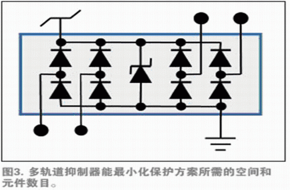 如果產(chǎn)品要在輸入/輸出線(xiàn)中承受某些額外阻抗(如在單端邏輯輸入時(shí)經(jīng)常出現(xiàn)的情況),可以通過(guò)在外部夾鉗和IC引腳之間增加一個(gè)電阻器,使外部和芯片上二極管之間的電流有助于外部防護(hù)(圖2b)。一些TVS二極管供應(yīng)商在單一小型組件包里提供兩個(gè)結(jié)型二極管和一個(gè)TVS夾鉗,進(jìn)一步減少組件數(shù)目、降低裝配成本,避免互連偏離。這些組件包同樣適用于多軌道情況——單一的組件包為幾條普通供電軌提供保護(hù)(圖3)。
