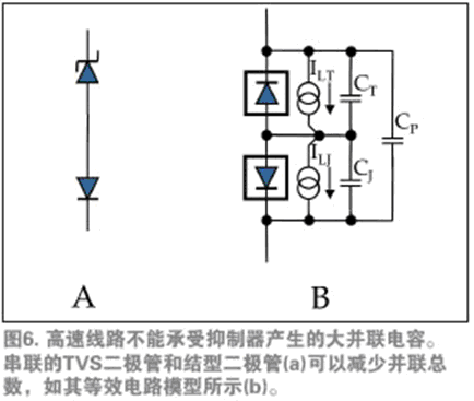 例如,如果某元件僅需要單向運(yùn)行,抑制器制造商可以通過(guò)一系列TVS二極管和結(jié)型二極管形成低電容抑制器(圖6a)。在斷開(kāi)狀態(tài)下,這種結(jié)構(gòu)的純電容等于