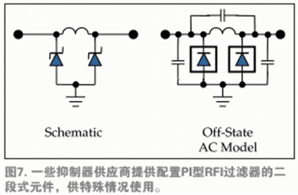 類(lèi)似圖1b中的片上二段夾鉗結(jié)構(gòu)也應(yīng)用于外部夾鉗,在相同設(shè)備中同時(shí)實(shí)現(xiàn)瞬態(tài)超電壓防護(hù)和電磁干擾(EMI)過(guò)濾。這種布局是基本的π形網(wǎng)絡(luò),同時(shí),TVS二極管的寄生電容有利于完成EMI過(guò)濾。電阻和感應(yīng)網(wǎng)絡(luò)均可直接利用,滿(mǎn)足各種實(shí)體電路層對(duì)于信令的具體要求(圖7)。抑制器供應(yīng)商通常按照通信標(biāo)準(zhǔn)在選擇器向?qū)е袑?duì)元件加以區(qū)分,確保適當(dāng)?shù)膸捄湍承┨匦宰杩沟膽?yīng)用。