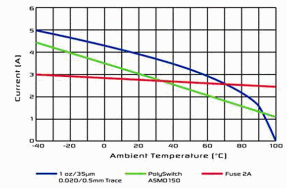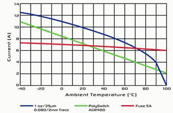 必須注意的是,在整個溫度范圍內,PPTC器件的觸發電流是如何跟隨印制線上的電流。在這兩種情況中,即使可以使用熔斷器,在汽車高于有用的標準溫度下,尺寸最接近的熔斷器也不能保護它。