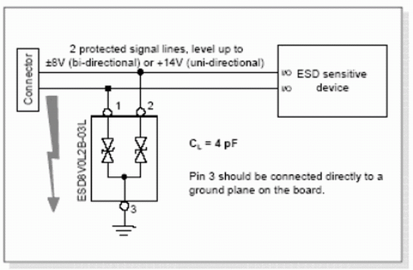 如圖4所示,USB2.0傳輸鏈路的差分?jǐn)?shù)據(jù)線應(yīng)連接至ESD8V0L2B-03L的管腳1和管腳2上。二極管的管腳3接地。由每個(gè)二極管產(chǎn)生的線路電容都是4pF,差分線間的電容為2pF。