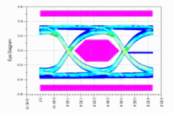 為了通過(guò)眼圖比較不同ESD二極管電容的效果,根據(jù)USB2.0規(guī)范對(duì)USB2.0測(cè)試裝置進(jìn)行評(píng)估。采用USB2.0 6號(hào)測(cè)試模板來(lái)展示完整的USB2.0傳輸鏈路效果,傳輸鏈路從USB2.0驅(qū)動(dòng)器的輸出端(發(fā)送器輸出管腳)開(kāi)始。該鏈路裝置包含TX和RX側(cè)(每側(cè)為 5pF)的PCB電容效應(yīng)、兩個(gè)ESD保護(hù)電路(集線器和器件上的ESD二極管)、USB電纜(5米長(zhǎng),損耗符合規(guī)范)和接收器的輸入電容(5pF)。