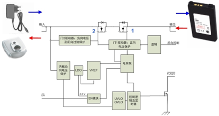 移動設備的直接充電通道面臨著浪涌電流效應和正/負向過壓等風險。適配器熱插入的瞬間,由于線纜的寄生電感和輸入電容的緣故,危險的高壓振鈴可能會損害移動設備中敏感的集成電路(IC)。在這方面,設想的移動設備保護方案應可通過控制保護方案內的MOSFET的導通,使移動設備輸入電流和輸入電壓不超過IC所能承受的電壓值,從而保護移動設備免于源自各種應用環境下可能存在的過壓故障的損害,如由適配器內部故障產生的正向過壓、適配器插反產生的負向過壓等。