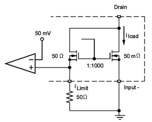 電子熔絲使用SENSEFETTM來開關電源、限制電流及監測輸出電流。SENSEFET的優勢是僅測量小部分的負載電流。沒有SENSEFET,全部負載電流將要流經感測電阻,而這將需要大功率、極低阻抗的電阻。與價格不足1美分的小型片式電阻相比,這些電阻較昂貴。