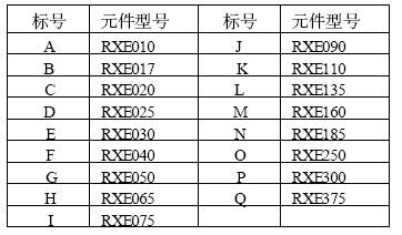 RXE系列PolySwitch元件20℃時(shí)的動(dòng)作保護(hù)特性曲線(xiàn)見(jiàn)圖1。其中橫坐標(biāo)表示故障電流,單位為安培,縱坐標(biāo)表示動(dòng)作時(shí)間,單位為秒。兩個(gè)坐標(biāo)軸均為對(duì)數(shù)坐標(biāo)。圖中每一條曲線(xiàn)對(duì)應(yīng)一個(gè)型號(hào)的元件,構(gòu)成該系列元件的動(dòng)作保護(hù)特性曲線(xiàn)簇。表2為圖1中曲線(xiàn)標(biāo)號(hào)與元件型號(hào)的對(duì)照表。