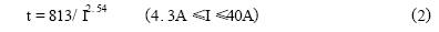 由表1可知,RXE系列PolySwitch元件所能承受的最大電流為40A。該點(diǎn)與臨界點(diǎn)之間為曲線(xiàn)的直線(xiàn)部分。設(shè)動(dòng)作時(shí)間為t(秒),故障電流為I(安),考慮到橫軸、縱軸均為對(duì)數(shù)坐標(biāo),兩者之間應(yīng)具有如下數(shù)學(xué)關(guān)系: