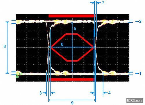 通過在示波器的垂直軸對(duì)數(shù)字信號(hào)進(jìn)行反復(fù)采樣、同時(shí)采用相應(yīng)數(shù)據(jù)率對(duì)水平時(shí)間掃描進(jìn)行觸發(fā)來生成眼圖。所獲得的圖形看上去象眼睛,如圖1所示。“眼睛”越大,數(shù)據(jù)完整性越高。通常采用模板(mask)來對(duì)可接受的信號(hào)質(zhì)量進(jìn)行定義。這模板由“眼睛”中間的六角形和“眼睛”上、下的矩陣組成。如果測(cè)得的信號(hào)跡線穿越模板的邊線,那么信號(hào)質(zhì)量就不可接受。USB2.0信號(hào)模板規(guī)范由USB應(yīng)用者論壇(USBIF,www.usb.org)提供,可參見USB2.0版規(guī)范第7.1.2.2章節(jié)。圖1中顯示了帶有詳細(xì)臨界點(diǎn)的眼圖。