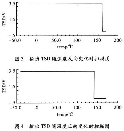按照以上設計的電路。用Cadence Specture對其進行仿真,器件的模型參數采用0.35μm CMOS工藝。圖2為過溫保護電路的輸出控制信號TSD,隨溫度上升和下降的曲線。電源電壓取3.3 V。從仿真結果可以看出,該電路實現了良好的“溫度遲滯”特性。遲滯功能有效的避免了芯片出現熱振蕩問題。關斷溫度TH160°和恢復溫度TL140°。