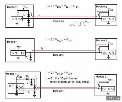 突崩式TVS二極管雖然擁有高突波規(guī)格,但相對較大的電容值使得這類元件成為負(fù)載切換開關(guān)與直流電源匯流排保護(hù)應(yīng)用的較佳選擇,相反地,二極管陣列適當(dāng)?shù)耐徊ㄒ?guī)格與較小的電容值則較適用于高速資料連接線的保護(hù),突崩式TVS與二極管陣列通常可以交互使用,但部份電路在選擇適合採用的元件時則需要經(jīng)過仔細(xì)的分析。(圖四)描述了當(dāng)存在一個電流可以透過資料線流經(jīng)二極管陣列路徑時所發(fā)生的向后驅(qū)動問題,如果VDD2大于VDD1,那么資料連接線有可能意外地提供電源給模組1,這個情況可能會造成邏輯晶片的電源啟動問題,或是在斷電后模組1上指示燈被點亮的異常狀況。