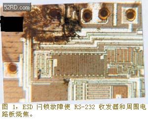 圖1示出了最近對一種頻繁失效的CMOS數據收發器IC進行的ESD閂鎖效應調查的結果:在某些情況下,IC封裝帶電,并燒毀了下面的電路板。為了確定故障的原因,用一臺記錄儀器監視電源和RS-232收發器的輸入端。記錄的波形顯示出在收發器器件的輸入端和電源腳有短時的電壓瞬變。當這些瞬變電壓迫使寄生PNPN結構導通時,就發生閂鎖效應。一旦寄生的SCR導通,SCR就是電源通過器件到地的一條低阻通路。在這樣的條件下,通路中的電流很大,從而導致器件中因熱過載而熱耗散異常。過度的熱過載會使塑封外殼升溫并開裂。
